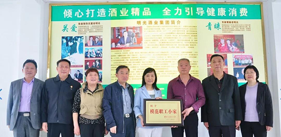 2019年5月6日,滁州市總工會王瑞雪副主席,王菊寧部長、尹利珠主任、劉榮水主任在明光市人大副主任、明光市總工會主席汪乾坤、吳德友部長、張恒部長陪同下,蒞臨明光酒業(yè)考察并為明酒榮膺“全國模范職工小家”授牌。