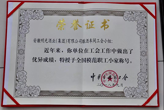 在明光酒業(yè)釀酒車間工會活動室,明酒黨委副書記龐宗生,領(lǐng)取了“全國模范職工小家”單位證書、獎牌、光榮冊。
