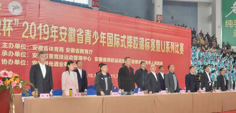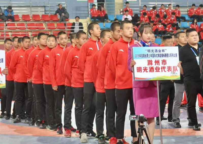 2019年10月31日,明光酒業(yè)杯2019年安徽省青少年國(guó)際式摔跤錦標(biāo)在明光市老明光體育館拉開(kāi)帷幕。此次比賽由安徽省體育局和省教育廳聯(lián)合主辦,由省重竟技運(yùn)動(dòng)管理中心、省摔跤協(xié)會(huì)和明光市政府聯(lián)合承辦,明光酒業(yè)獨(dú)家冠名。共有來(lái)自全省15支地市代表隊(duì)約800余名運(yùn)動(dòng)員、教練員參加比賽。安徽省政府經(jīng)濟(jì)顧問(wèn)張彥、省摔跤協(xié)會(huì)副主席盛澤糖、秘書(shū)長(zhǎng)汪路線,滁州市教工委書(shū)記局長(zhǎng)李中東,明光市市長(zhǎng)徐軍,副市長(zhǎng)張艷、政協(xié)副主席呂錦宏,明光教工體委書(shū)記局長(zhǎng)徐勝利,明光酒業(yè)總經(jīng)理鞏建、黨委副書(shū)記龐宗生、紀(jì)委書(shū)記閆興淮等在主席臺(tái)就座。開(kāi)幕式由明光市委副書(shū)記劉東主持。