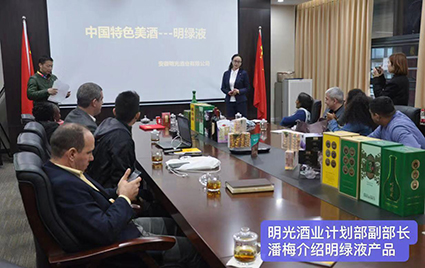 在中國特色產品推介環節,安徽明光酒業有限公司榮譽出品的國家發明專利明綠液,為此次重點推介產品,黨委委員、銷售公司總經理劉邦,高級政工師、銷售公司黨支部書記錢軍、計劃部副部長潘梅及銷售公司徐峰四人,主動熱情、專業推介,讓發展眾多中國家政府官員在充分感受明酒人熱情的同時,對明綠美酒更是情有獨鐘,紛紛要求建立長期聯系。埃塞俄比亞獨立通訊管理局首席顧問Yasir Yones Mousa Younis熱情邀請明光酒參加他們國家的品酒節,讓更多的國人享受來自東方大國明朝開國皇帝家鄉的美酒。
