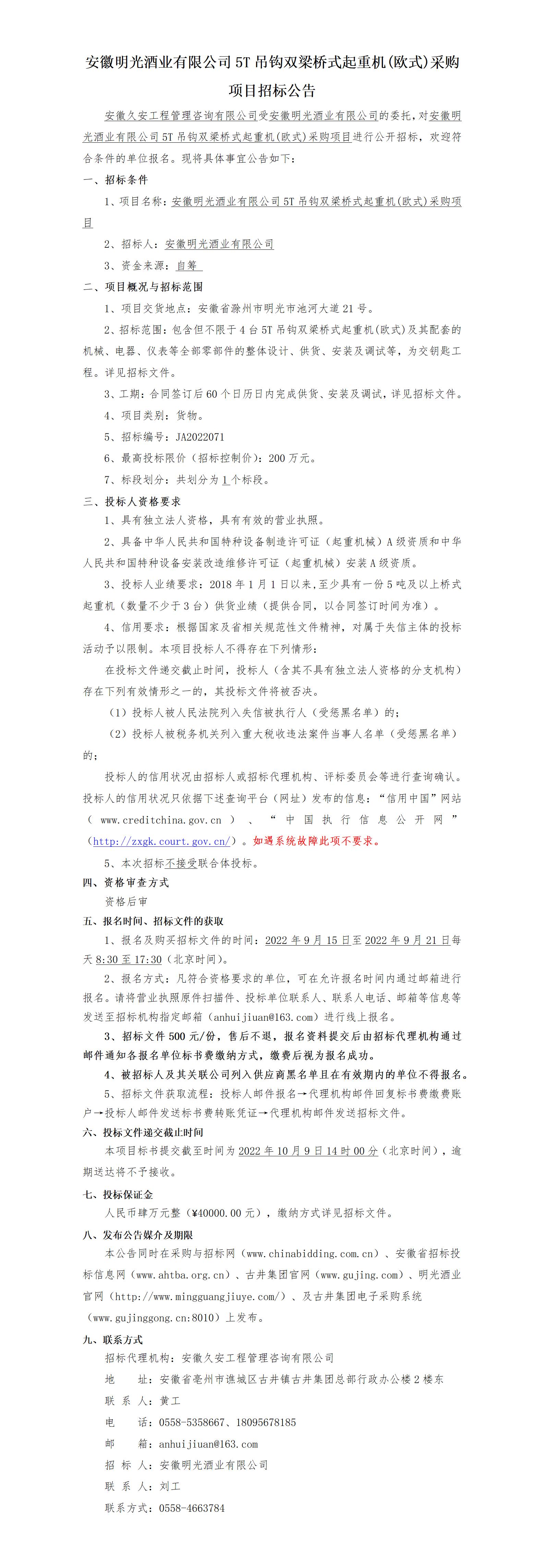 安徽明光酒業有限公司5T吊鉤雙梁橋式起重機(歐式)采購項目招標公告