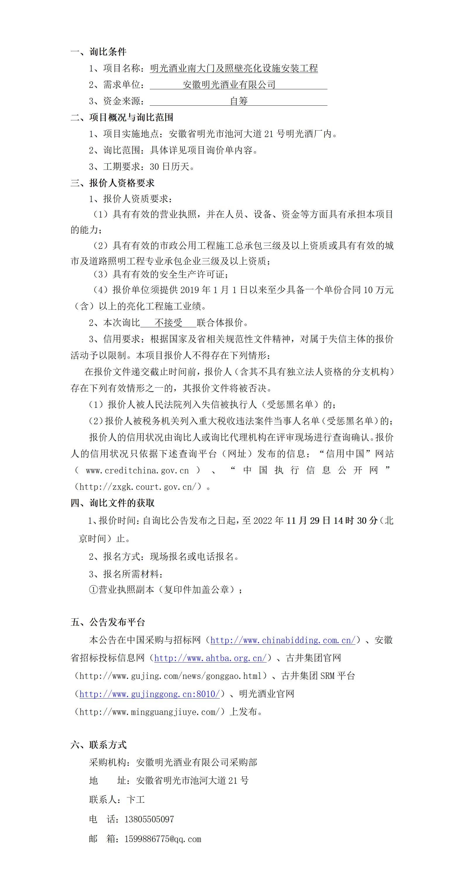 明光酒業南大門及照壁亮化設施安裝工程項目詢比公告