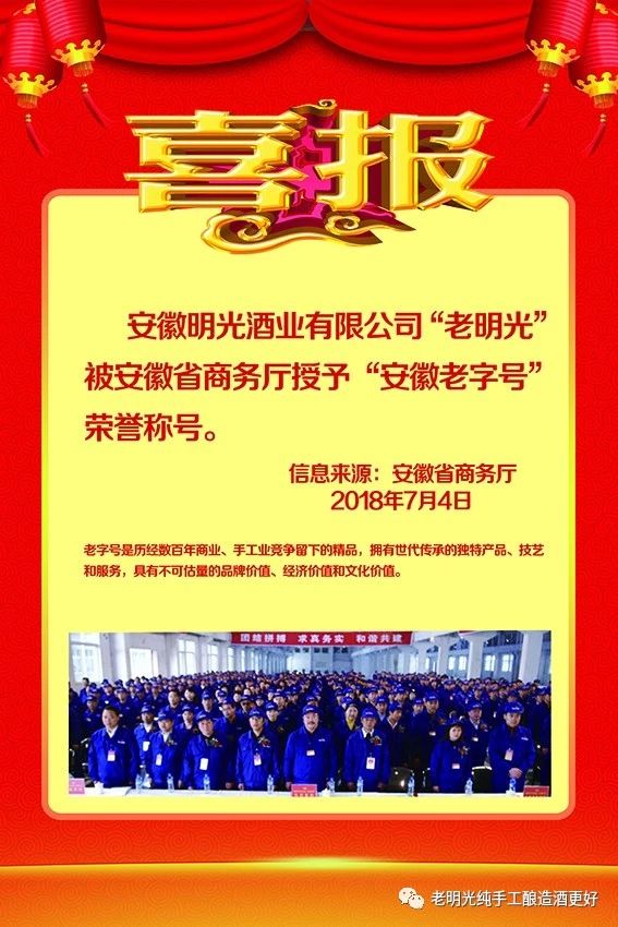 喜報:明光酒業“老明光”榮膺“安徽老字號”榮譽稱號。