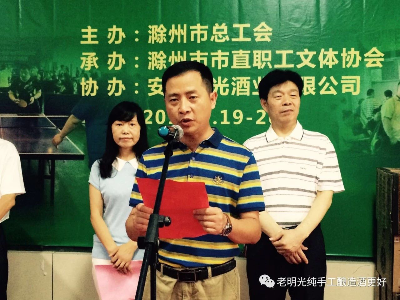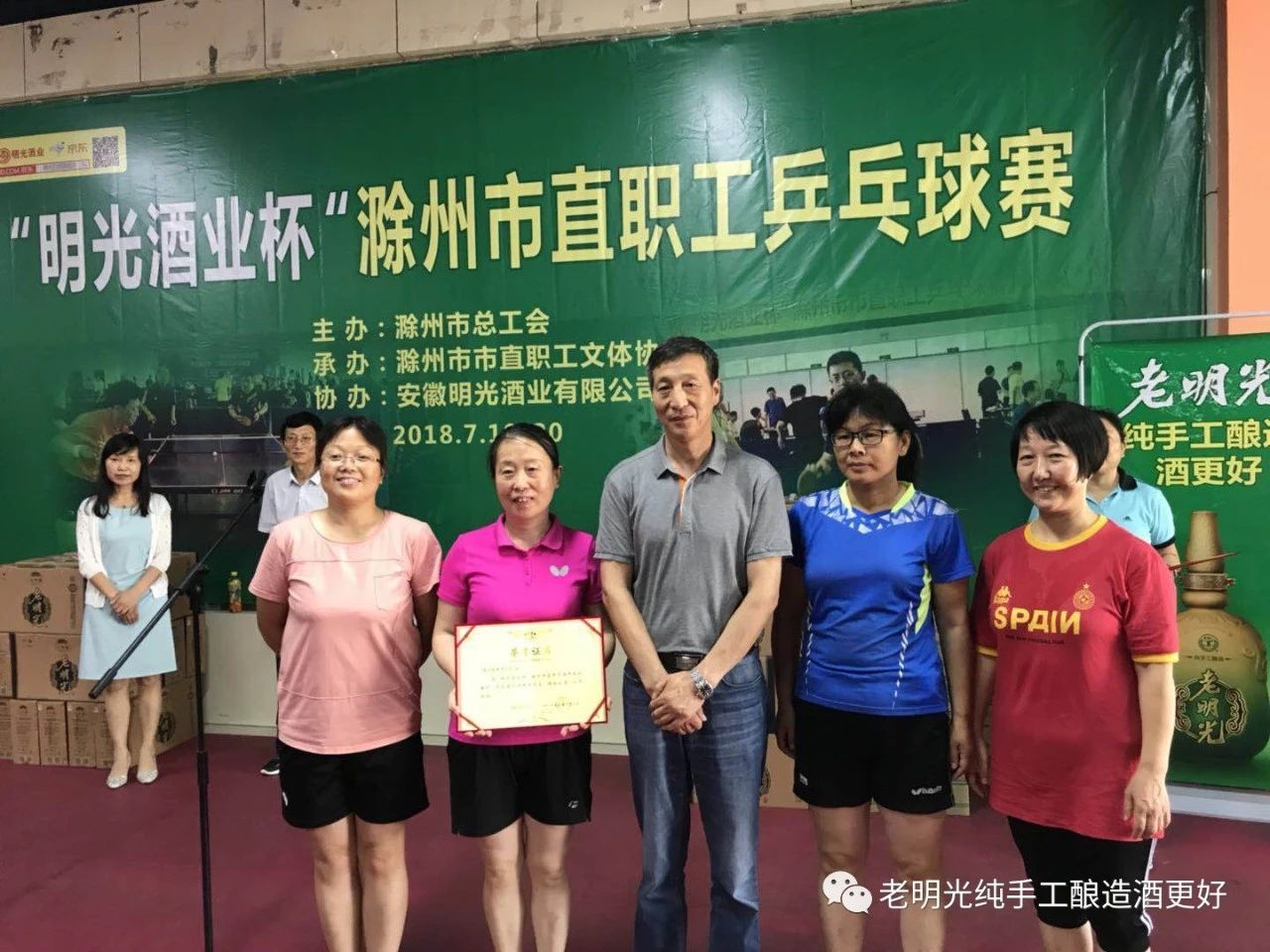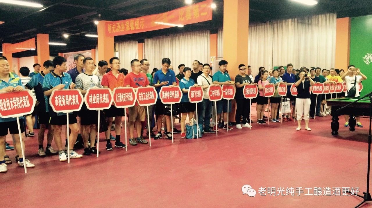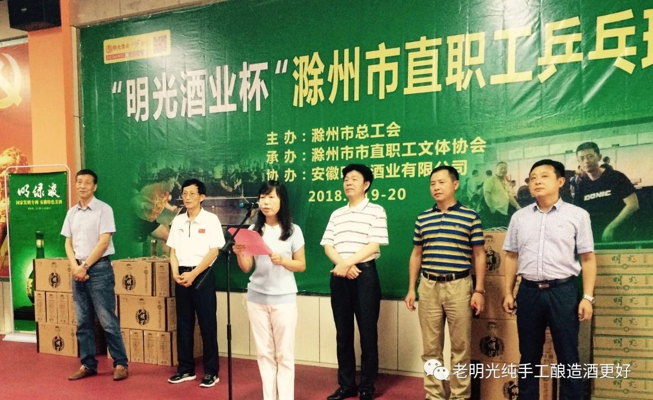 2018年7月19日,為期2天的“明光酒業杯”滁州市直乒乓球賽在滁州體育館隆重開幕。滁州市總工會黨組書記錢家廣、滁州市教體局楊州局長、教體局群體科科長姜基斌、體育館館長胡玉喜、滁州市總工會群體協會主任尹麗珠、明光酒業滁州大區經理李茂武,明光酒業銷售公司黨支部書記錢軍、明光酒業滁州辦事處主任李平、滁州相關媒體和來自市職職工文體協會理事及理事單位的25支代表隊,118名運動員參加了開幕式。開幕式由滁州市總工會副主席王瑞雪主持。滁州市教體局楊州局長致開幕詞,明光酒業滁州大區經理李茂武致歡迎詞。教練員、運動員代表宣誓后,滁州市總工會黨組書記錢家廣宣布:“明光酒業杯滁州市直乒乓球比賽---開賽!