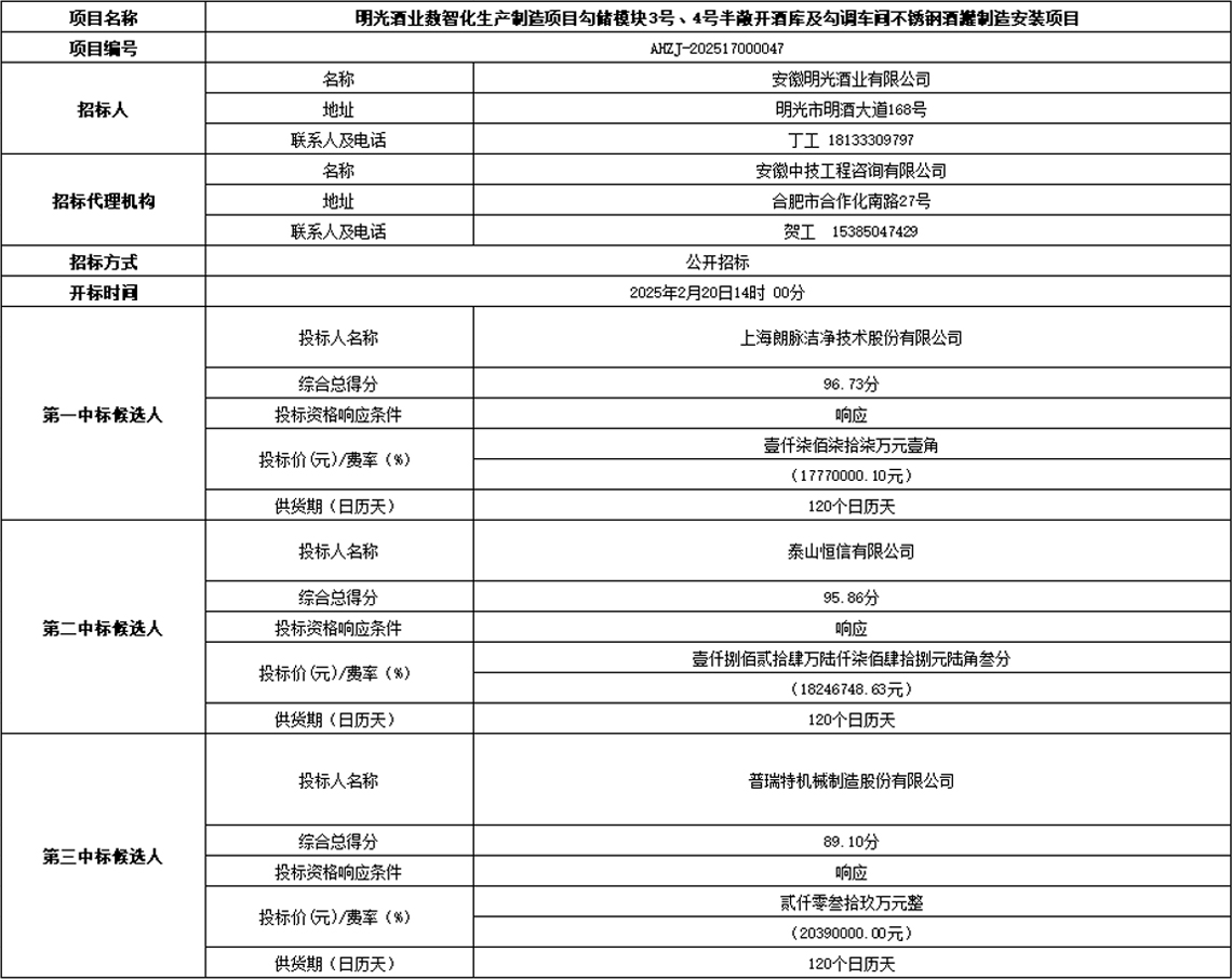 本公示同時(shí)在中國(guó)采購(gòu)與招標(biāo)網(wǎng)(https://www.chinabidding.com.cn/)、安徽省招標(biāo)投標(biāo)信息網(wǎng)(http://www.ahtba.org.cn/)、安徽古井集團(tuán)官網(wǎng)(http://www.gujing.com)、古井集團(tuán)SRM平臺(tái)(https://www.gujinggong.cn)、明光酒業(yè)官網(wǎng)(http://www.mingguangjiuye.com)上發(fā)布。 |